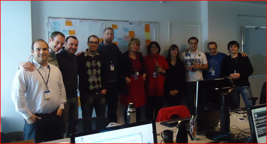 O primeiro passo foi uma mudança no layout e agrupamento do time, colocando lado-a-lado todos os profissionais que trabalhavam diretamente no projeto, desde o analista de negócios, designers, analista de SEO, programadores, testador, etc.