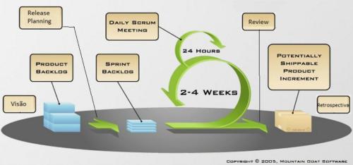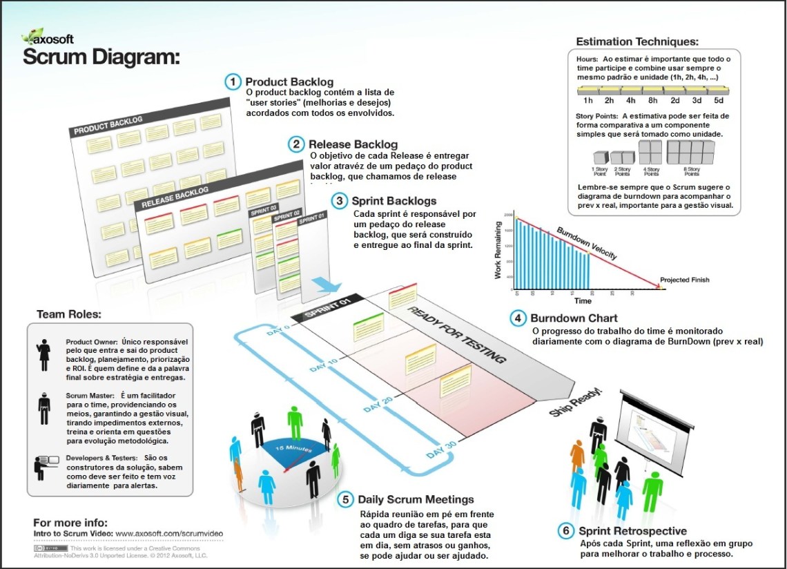 O diagrama abaixo é uma excelente abstração do core do método Scrum, mas a AxoSoft também tem em seu site um vídeo maravilhoso sobre o papel desempenhado por nós, Scrum Masters (clique aqui para ver o vídeo).