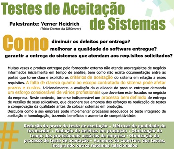 Nós da RBS comparecemos em bom número a palestra sobre testes de aceitação ministrada pelo diretor da DBServer Verner Heidrich, confirmando alguns pressupostos sobre riscos, gargalos e a necessidade de estruturar uma área de testes mais efetiva para garantir maior qualidade em software.