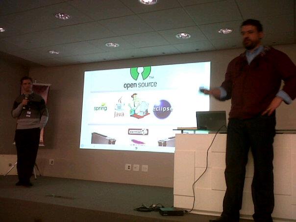 Finalmente, pouco depois das 21 horas, os colegas Cassio Trindade e Lincolm Aguiar assumiram com uma palestra que apresentou tecnicamente, camadas, servidores e serviços utilizados na arquitetura e plataforma dos sites Pense. O Cãssio é analista e arquiteto do Pense e o Lincolm atua como arquiteto de soluçôes da unidade de produtos digitais da RBS no TecnoPUC.
