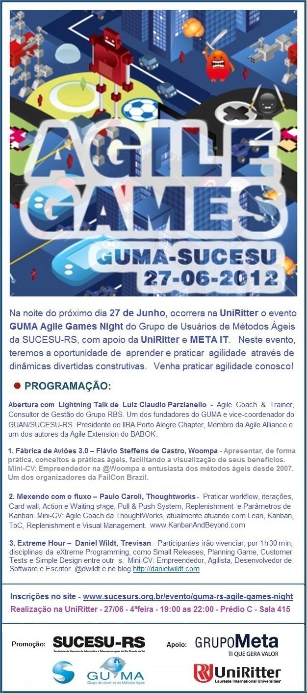 Local, data e hora confirmadas – UniRitter em 27/06, uma quarta-feira das 19:00 as 22:00, no prédio C, salas 415. Programação fechada, quatro dos maiores agilistas brasileiros estarão lá compartilhando conhecimento através de dinâmicas fáceis e divertidas. Patrocínio confirmado, a META IT estará lá e proporcionará o momento de Coffee, com muito networking entre os presentes.