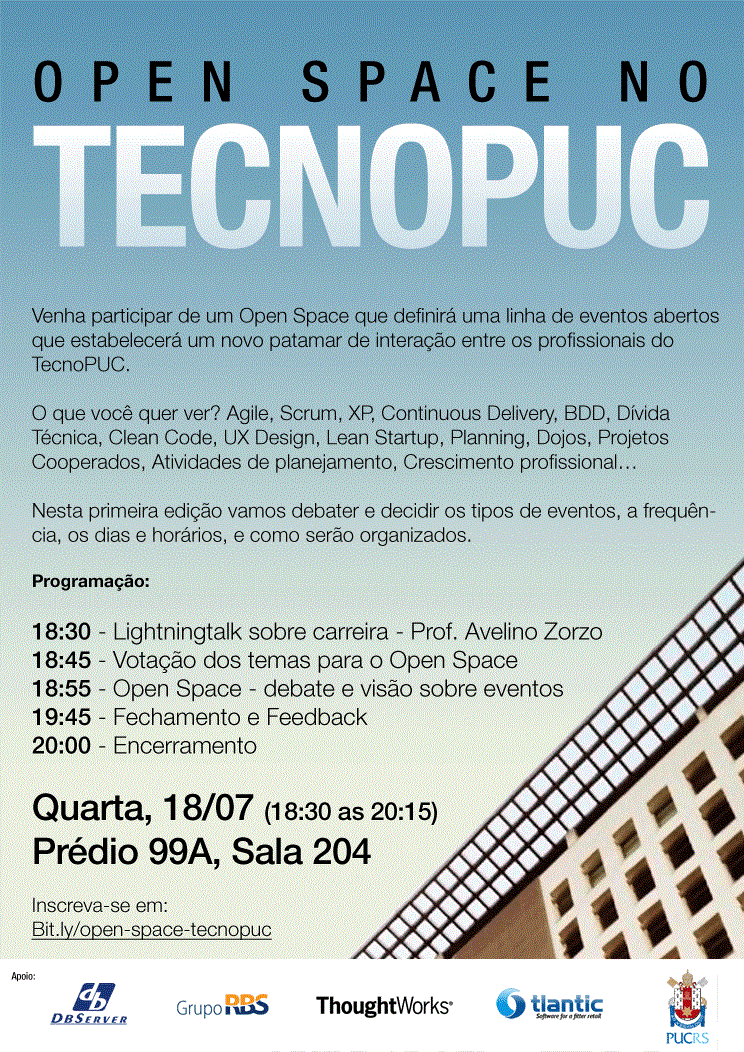 No dia 18/07/2012 entre 18:30 e 20:15, teremos um Open Space exclusivamente para profissionais que trabalham em empresas aqui do TecnoPUC, com o objetivo de gerar a oportunidade de debater sobre que tipo de evento a galera quer, em que dias e horários, com que frequencia e de que forma querem participar de sua organização e realização.