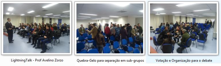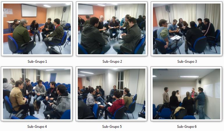 2º. Após a LightningTalk de abertura, houve um quebra-gelo para a distribuição das 36 pessoas presentes em seis sub-grupos de discussão e a votação pelo tema, decidindo-se que todos os grupos iriam debater e apresentar um plano com :