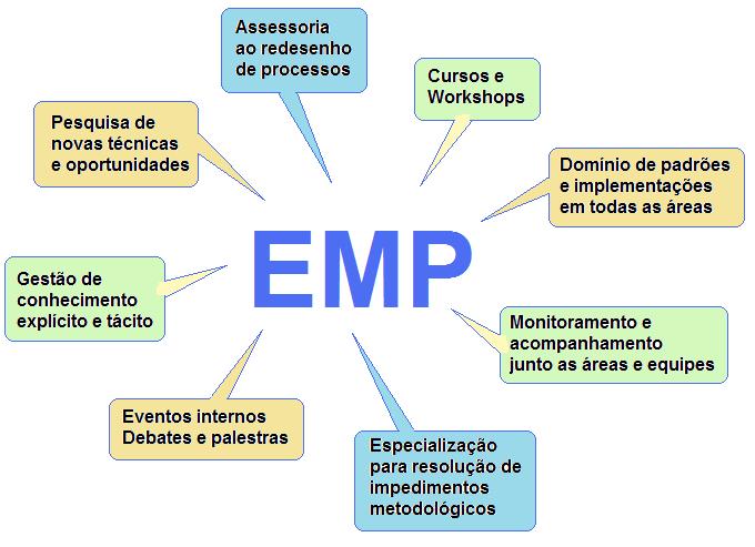 Seria uma unidade organizacional que primeiramente exerceria uma ação educativa, por meio de cursos e workshops, apresentando métodos, processos, boas práticas, técnicas, cases, gerando eventos internos e externos para disseminação e geração de conhecimento tácito e explícito, devendo em um segundo momento participar ativamente da modelagem e acompanhamento de mudanças de processos de todas ou determinada(s) área(s) da empresa.