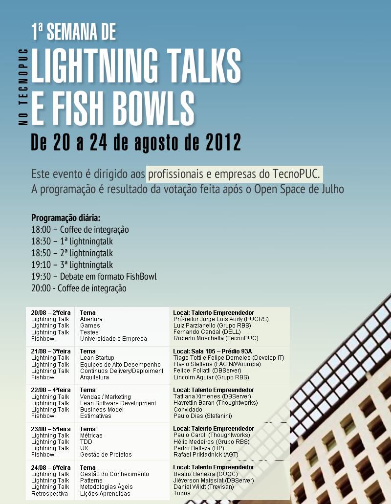 Se voce trabalha no TecnoPUC ou na PUC, participe da 1ª Semana de Lightning Talks e FishBowls, mas não deixe para se inscrever na última hora, pois as vagas são limitadas. Serão cinco dias com colegas e convidados compartilhando muito conhecimento e vivências, que ao final nortearão os próximos eventos, talvez com mini-cursos ou workshops, palestras, painéis, games, dojos, etc.