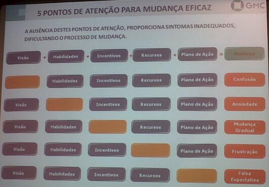 Segundo a Georgiana, há 5 pontos de atenção para uma mudança ser eficaz e a falha no endereçamento de cada uma delas leva a um sintoma que poderia ser percebido na organização como consequencia desta falta de atenção: