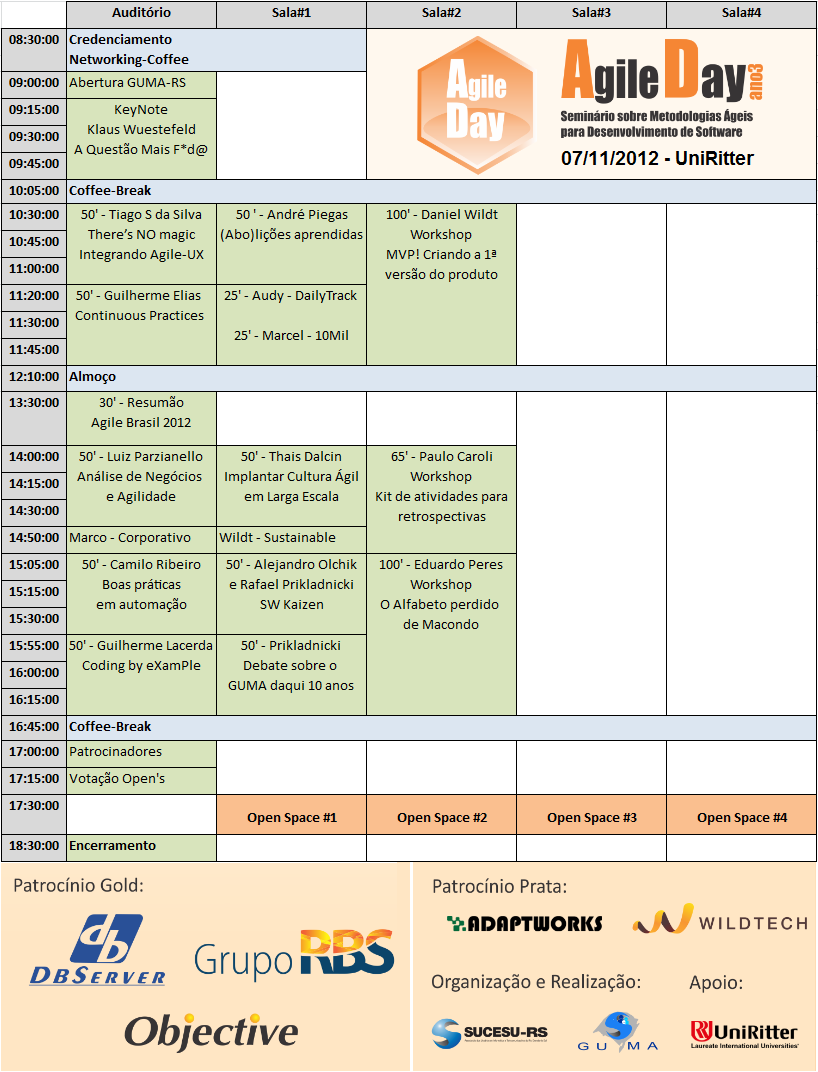15 Min – Rafael Prikladnick – diretor da AGT/PUCRS – O GUMA daqui dez anos (Discussão com participantes, oportunidades para os Grupos de Usuários, em especial, qual o futuro do Grupo de Usuários de Métodos Ágeis do RS?).