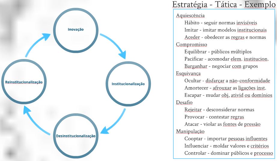 Mas, uma das abordagens mais interessantes que percebi no texto sobre o neo-institucionalismo foi o ciclo de institucionalização > desinstitucionalização > reinstitucionalização > inovação, apresentando prismas de estratégia, tática e exemplo percebidos sob diferentes aspectos de sua operacionalização: