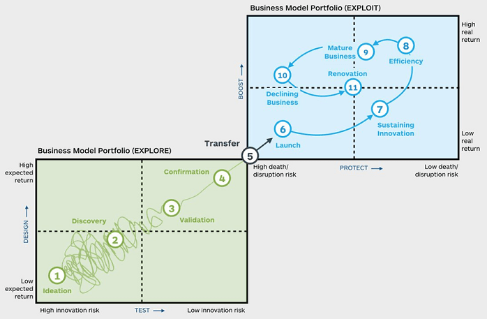 Há um canvas proposto pelo Boston Consulting Group, conhecida como Matriz BCG, que tem em seu eixo X a participação de mercado e no eixo Y a taxa de crescimento do mercado. Uma provocação relativa ao equilíbrio entre Exploration e Exploitation está brevemente demonstrada abaixo:
