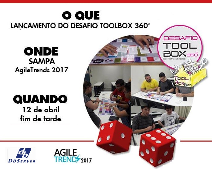 Lanço aqui o desafio aos meus contatos no Facebbok que irão ao Agile Trends 2017 no Centro de Convenções Rebouças na semana que vem em SP, no final do primeiro dia de evento estarei fazendo uma oficina de Desafio ToolBox 360º para quem for no stand da DBServer durante o primeiro dia e se inscrever.