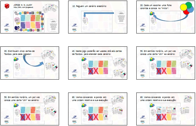 A facilitação contará com um passo-a-passo em powerpoint e impresso para cada equipe, que contarão com um kit contendo o tabuleiro, fichas e baralhos. É para ser acima de tudo um momento de provocação quanto a conhecimento e domínio de técnicas oriundas de metodologias ágeis, design thinking, management 3.0, além de algumas bem tradicionais e ainda muito utilizadas.