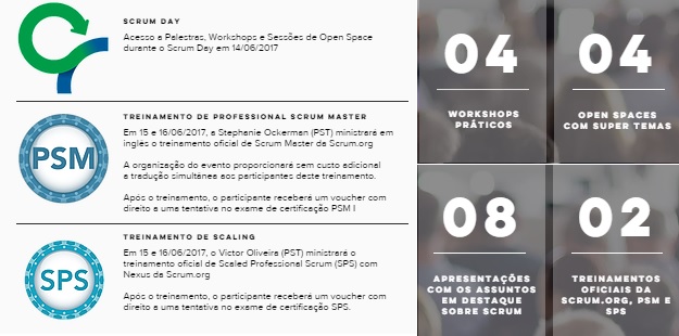 Serão palestras, relatos de casos, workshops e open spaces variados relacionados diretamente com a prática da metodologia ou do Scrum em escala, além de treinamentos oficiais com referências mundiais da própria Scrum Org.