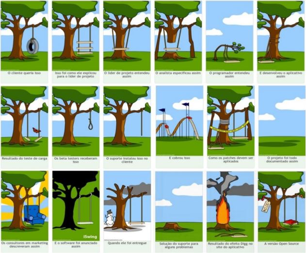 Durante a aula relembrei a charge das árvores sobre requisitos em um projeto, insisti na minha abordagem de profissionais de perfil T ou Pi, sobre nem só fazer errado a coisa certa, nem fazer certo a coisa errada, nossa meta é fazer certo a coisa certa. É entender o problema, para mapear alternativas e trabalhar a solução.