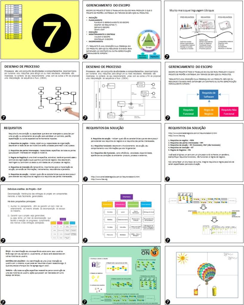A sétima aula foi muito pegada, pois após feriados, greve e prova, tínhamos muito o que fazer para colocarmos a pauta em dia. Em linhas gerais, discutimos alguns dos fundamentos mais importantes sobre planejamento de escopo:
