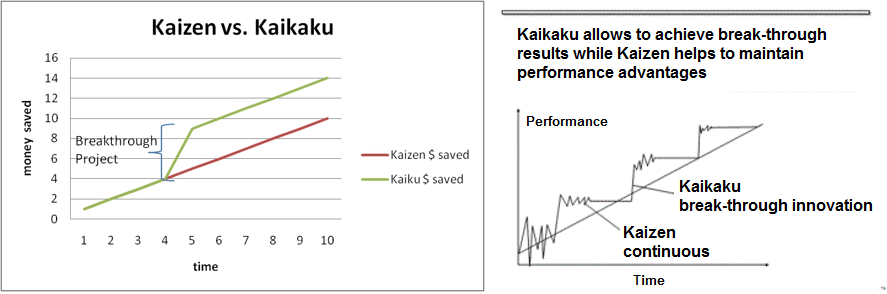 O Kaizen é um continuo evolucionário, Kaikaku é revolucionário, sendo que o processo de melhoria quando praticado de forma consciente, orquestrada, tende a consumir cada vez menos energia e gerar melhores resultados. Não podemos esquecer o que Schein, Argyris ou Tofler preconizaram quanto ao desafio de aprender algo novo, ação que consome energia e deve ser entendida e dominada: