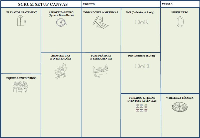 Compartilho uma versão A3 para impressão e uso do Scrum Setup Canvas. Não é para ser só mais um quadro com postits na parede, ele é vital ao gerar um debate sobre acordos e pré-definições pouco antes da realização de um Release Plan.