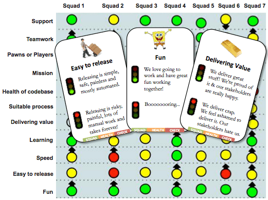 Esse é muito legal e seu uso é bem mais amplo, podendo ter nas colunas a auto-avaliação do time a cada sprint, uma forma de manter no radar os resultados obtidos com os planos de ação e iniciativas realizadas no transcorrer do projeto. O pdf já disponibiliza os cartões e semáforos, usamos as setas para dar a tendência – www.barryovereem.com/how-i-used-the-spotify-squad-health-check