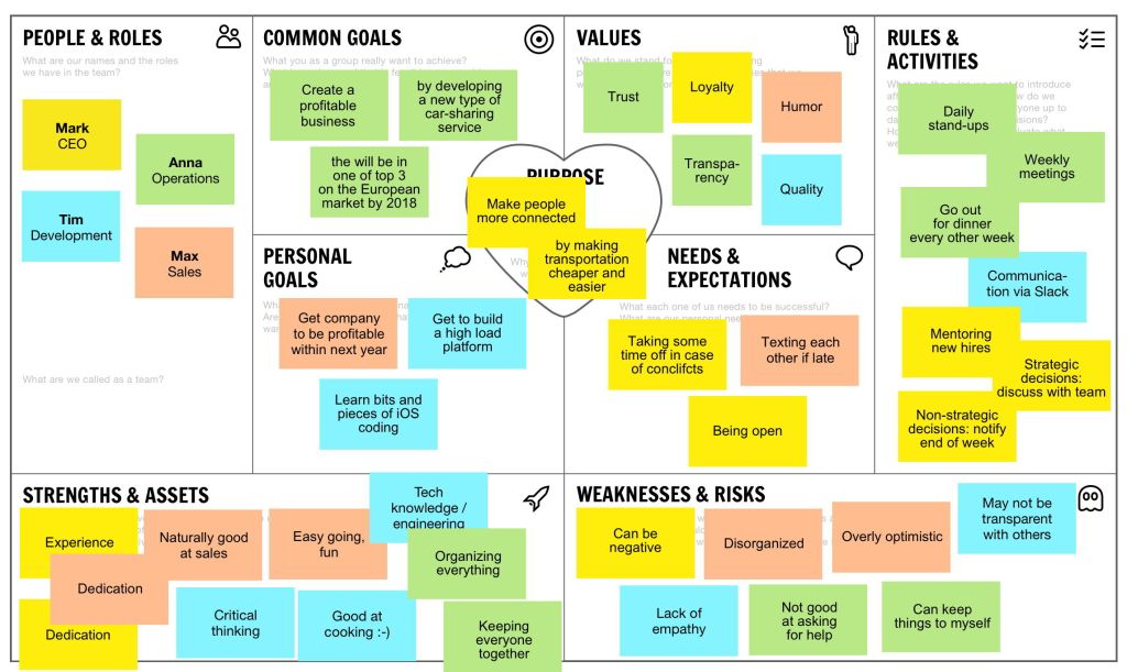 Um modelo mais envolvido com missão e valores, segundo seu autor, é complementar ao Team Canvas explicado e linkado logo acima. No site do autor ele recomenda que antes de preenche-lo de forma colaborativa uma das opções é realizar uma dinâmica de integração e provocação como o Lego Serious Play.
