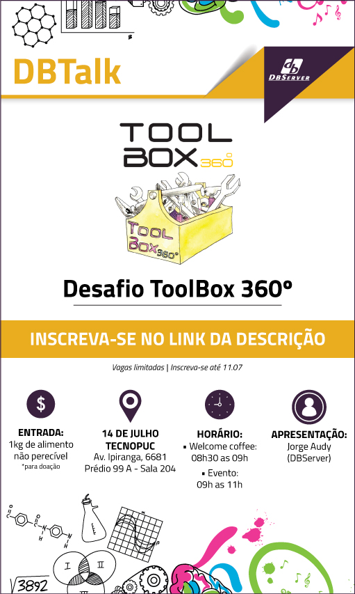 Estou devendo o lançamento do Desafio ToolBox 360º aqui em Porto Alegre e vai rolar com o DBTalk do dia 14/07 próximo com wellcome-coffee as 08:30 e começo 09:00.