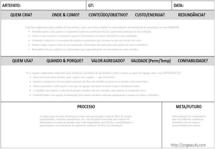 Uma folha para cada documento ou artefato, entre as pessoas interessadas, em um GT, não impondo certo ou errado, mas provocando uma reflexão e debate sobre cada oportunidade, construção e manutenção, custo x benefício.