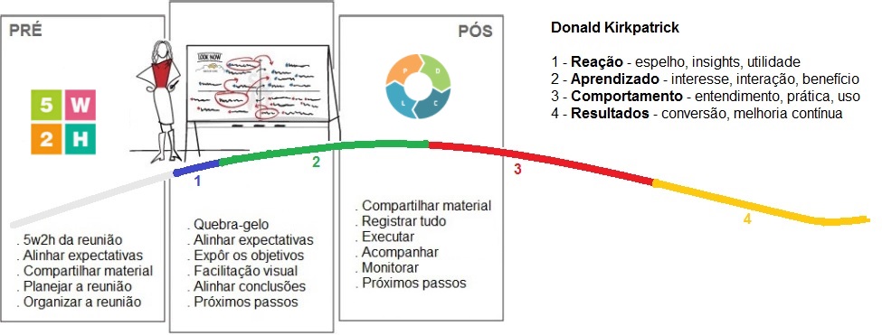 Eu tenho uma matriz temporal de condução para qualquer treinamento, conhecida por quem me acompanha, com um pré (organizar e instigar metas), há a execução (interagir e projetar) e um pós (experimentar, persistir e melhorar), onde acrescentei a curva de Kirkpatrick: