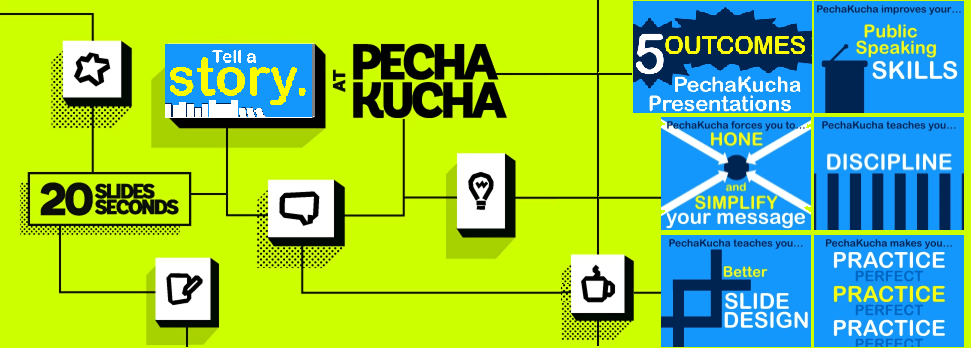 É um formato de apresentação em slideshow contendo 20 slides com 20 segundos cada, o palestrante fala enquanto as imagens avançam automaticamente. Criado pelos arquitetos Astrid Klein e Mark Dytham, a primeira edição aconteceu em 2003 na cidade de Tóquio em uma galeria, não encontrei registro de Pechas Kuchas aqui por perto – http://www.pechakucha.org