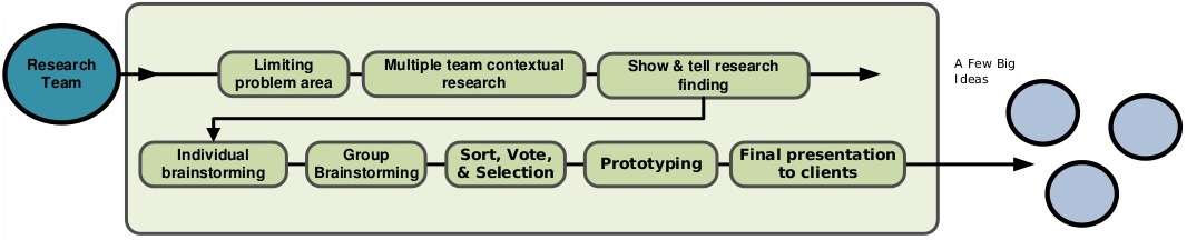 O primeiro passo é dedicado ao entendimento do que temos em mãos, já no segundo iniciam as técnicas e sessões de brainstorming, individuais, em grupos e coletivas, com amplo espectro, sem pré-conceitos, críticas, nem líderes. Só muitas ideias, debates e exposição visual.