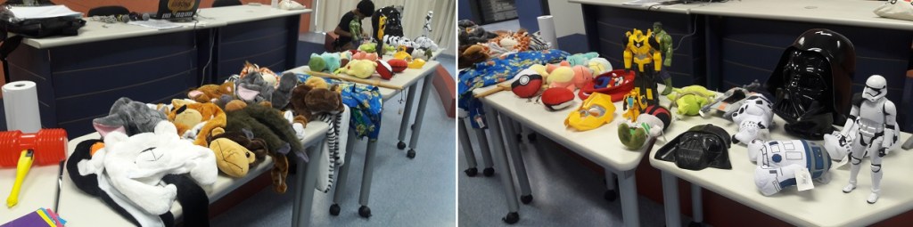 Para descontrair e fazer todo mundo entrar no clima levei um monte de toucas de bichos, vários de meus ítens relacionados a cosplay, que uso em treinamentos temáticos e curiosidades.