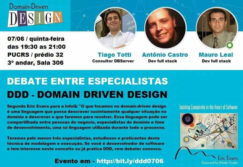Quinta-feira, 19:30 as 21:00, Debate Entre Especialistas sobre DDD (Domain Driven Design) – qual a práticade mercado, acertos e erros, como e por onde começar, como persistir e evoluir.
