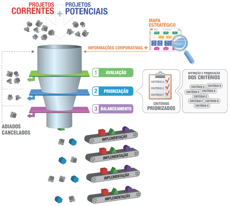 Uma dica importante é NÃO centralizar a discussão e priorização, é para ser algo orgânico, se houver submissão de projetos pelas áreas sem um processo bottom up com foco em avaliação|priorização|balanceamento, esta tarefa torna-se centralizada apenas no escopo do PMO para cima, negando conceitos de Gemba e proximidade/domínio essenciais para percepção de valor, analisados vários níveis hierárquicos acima.