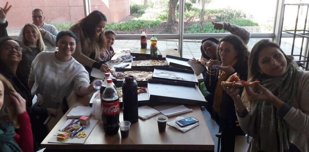 Quarenta participantes pela manhã e trinta a tarde, entretanto 14 estiveram presentes nos dois turnos e por isso pedimos muita Pizza e refri, que se juntou a nossa tradicional mesa de Coffee com frutas, cuca, biscoitos, merengues, Café Dolce Gusto e várias outras guloseimas.