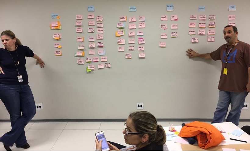 Foram em torno de três horas de debates, world café, clusterização, com revisão e edição das categorias propostas e ítens distribuídos entre Ações Externas, Dinâmicas, Método, Avaliação, Recursos, Engajamento … com muita descontração, brincadeiras e camaradagem.