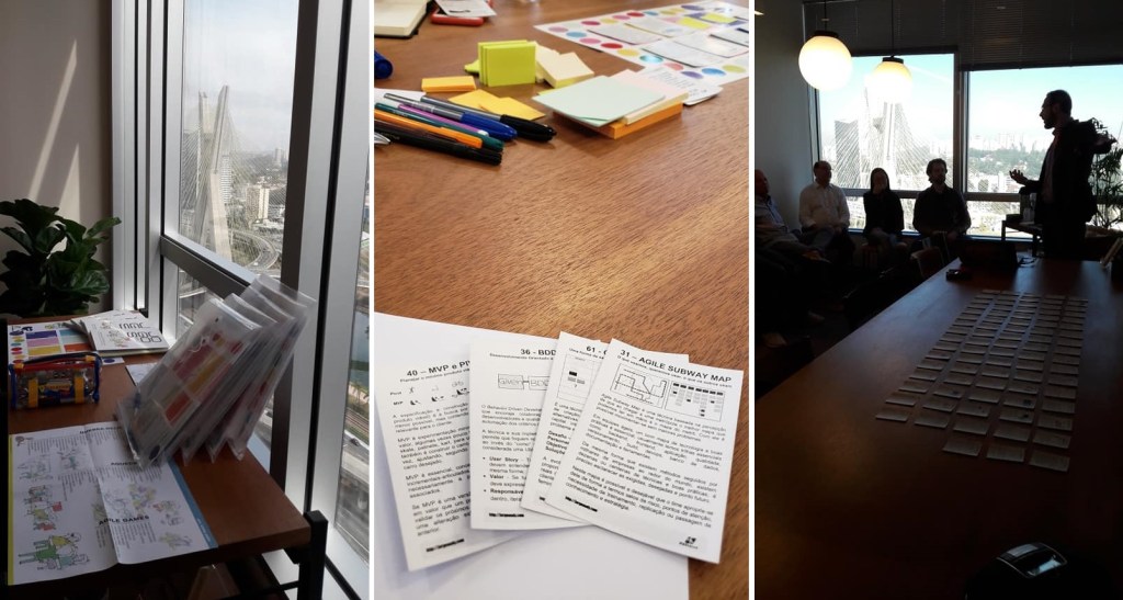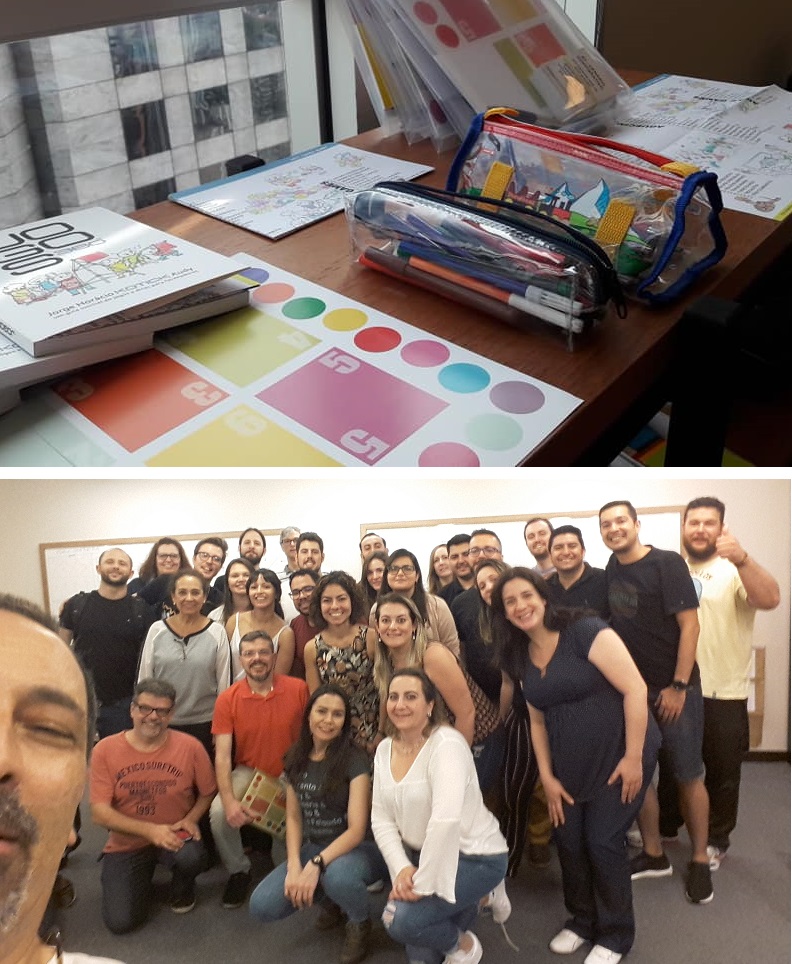 Eu tento ir ajustando os tempos de acordo com o perfil da turma, o que neste caso do primeiro em São Paulo fez com que ao final eu me estendesse por meia hora para exercitarmos e debatermos conceitos sobre Jogos, visto que Team Building Games foi o mais votado do mural e vários já vinham pedindo para aproveitar e discuti-los. Abrimos um espaço grande junto ao mural auxiliar com 116 jogos e fiz um purpuri, apresentando-os e exercitando-os ali mesmo com diferentes voluntários.