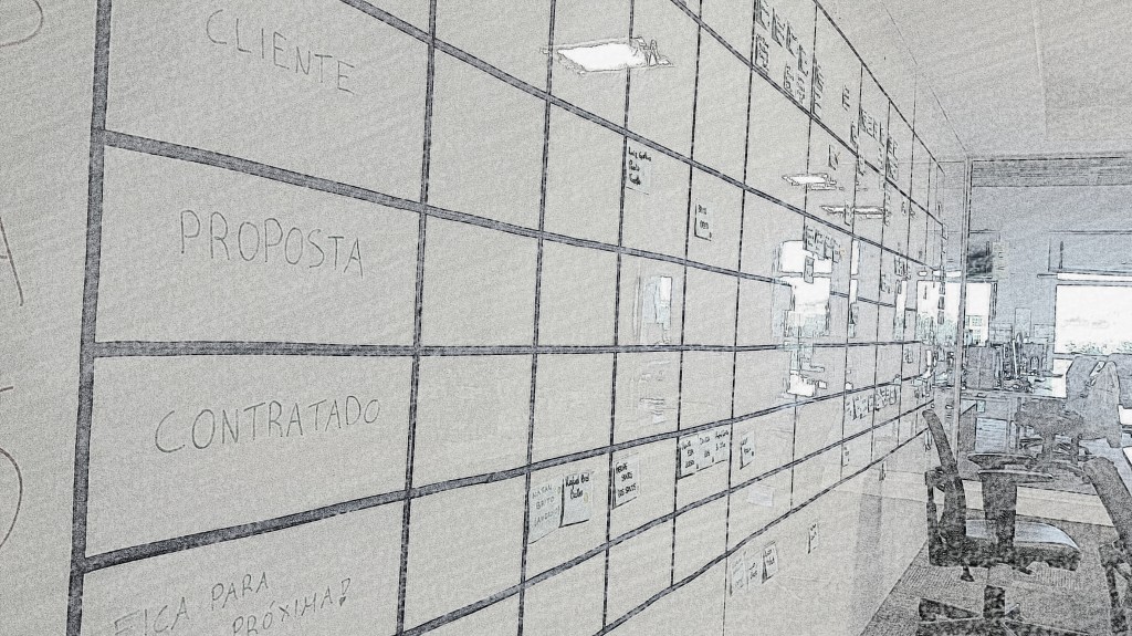 Em vendas, temos análise de mercado, contato, visita, proposta, decisão, minuta, contrato, assinatura, encaminhamento, e assim como no RH, reproduzimos na parede uma visão tática de nosso trabalho.