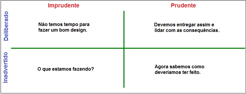 Fowler propôs um canvas para diagnosticar débito técnico que busca explicitar os fundamentos ou explicações racionais acordadas que o originam, explicitando ser aconteceu(rá) por pressa ou conveniência, um risco calculado ou desconhecido.