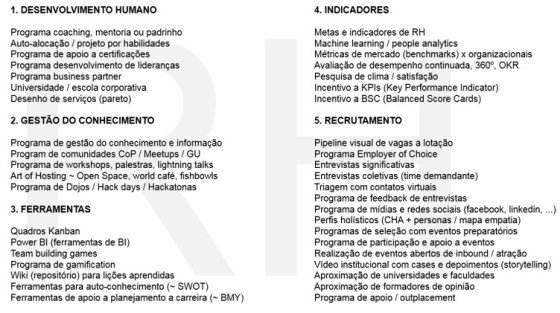 Uma edição com profissionais de RH, consultores de RH e profissionais de TI com interesse por questões de cultura, estratégia, tática e técnicas relativas a área de RH ou simplesmente Pessoas. Começamos relembrando as cinco categorias e disciplinas discutidas na primeira edição em 2018.