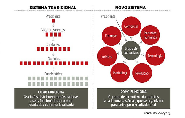 HALOCRACIA – Robertson propôs em 2007 uma estrutura com círculos (grupos) afíns de interesse, desafiados por um círculo de executivos por resultados, contando com eventos organizacionais para alinhamentos frequentes e deliberações, com papéis determinados a terem as alçadas necessárias para certas decisões.