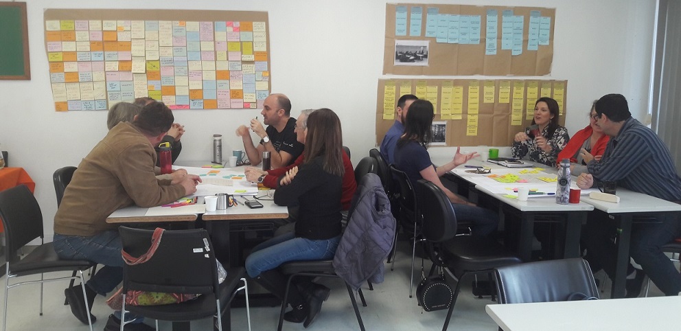 A partir dos temas definidos, uma visita aos murais e iniciou-se um world café em que todos participaram das discussões nos três grupos, cada qual com alguns dos temas propostos, selecionados por sua relevância. A cada rodada, mantendo um embaixador para revisão e retomada, todos os demais trocando de mesa.