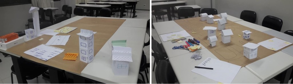 Planejam algumas sprints e a cada 3 minutos paramos para a daily e atualização do quadro Kanban. Previamente organizo a sala com várias mesas para cada equipe e sobre elas um grande papel pardo que é o terreno onde deverão desenhar as ruas e quadras, onde colocarão as edificações.