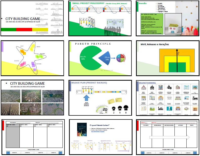 Tanto a versão 2D quanto a 3D é muito mágica, é possível deixar que os times decidam quais as construções do seu MVP de cidade, já usei como pano de fundo o Kubitchek e Brasília do zero, mas a versão que criei mais recente propõe um mix de edificações, propondo a definição do MVP e sua execução em sprints de 15 minutos.