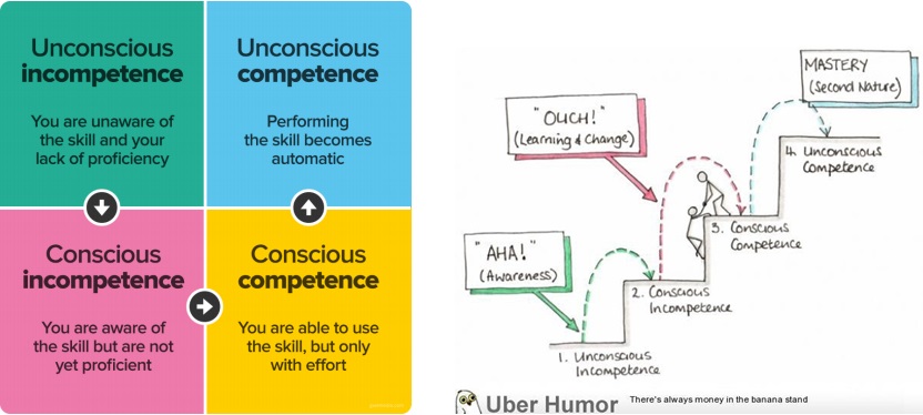 Conforme a wikipedia, o instrutor de administração Martin M. Broadwell descreveu o modelo como “os quatro níveis de ensino” em fevereiro de 1969. Na psicologia, este modelo de “competência consciente” está relacionados aos estados psicológicos envolvidos no processo de progredir da incompetência para a competência enquanto nova habilidade .