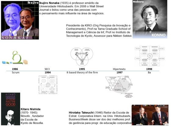 Um dos meus gurus sobre teorias das organizações que aprendem e se adaptam dinamicamente, é Ikujiro Nonaka, que com seus parceiros gerou algumas das propostas mais consistentes para nortear esta mudança. O modelo hipertexto propôs três dimensões organizacionais, uma formal, que estrutura e suporta, uma invertida com equipes auto-organizadas e uma terceira que explicita a gestão do conhecimento como um ativo organizacional.