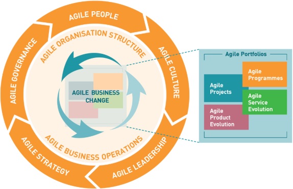 Segundo os gringos da Agile Business Consortium, o modelo abaixo foi co-criado pelos participantes do consórcio e “ilustra os elementos necessários para tornar qualquer organização realmente ágil. Executar projetos e operações de negócios é parte essencial da agilidade dos negócios, mas eles não transformarão uma organização por conta própria. As empresas precisam de uma estratégia compatível, incluindo uma abordagem ágil ao seu mercado.” https://www.agilebusiness.org/