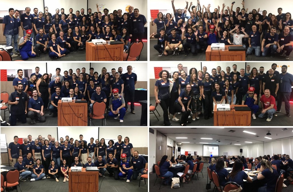 Uma semana de aceleração, +200 pessoas, 40 por dia na grande sala do Novotel, em times ou grupos de trabalho, líderes e liderados, inclusive equipe de secretariado, copa e limpeza. Um dos diretores fazendo o briefing inicial a cada manhã.