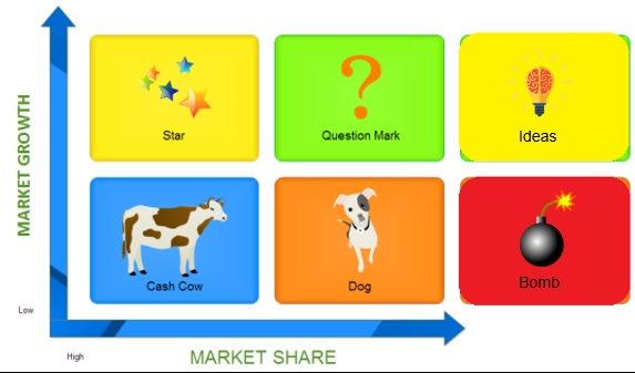 No canvas de mercado proposto pela Boston Consulting Group, temos um eixo com a percepção de nossa participação de mercado e outro com as perspectivas de expansão e crescimento deste mercado. No canvas clássico com quatro quadrantes, incluo frequentemente mais dois para enquadrar e visualizar ideias, possibilitando mapear produtos e serviços, tanto quanto discutir nossa estratégia.