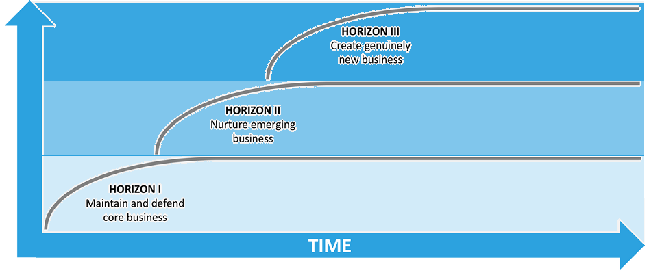 Baghai , Coley e White em 2000 propuseram o modelo dos Três Horizontes, permitindo que a gerência sênior visse como seria uma organização realmente ambidestra, no conceito de que empresas precisam executar modelos de negócios existentes e simultaneamente inovar, alavancando a visão de distribuição e preparação para o futuro, valorizando um equilíbrio entre produtos e programas estáveis e de inovação.