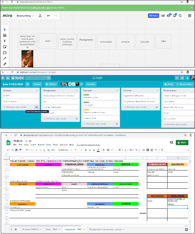 No Miro era possível ver 10 cursores com os nomes de cada um enquanto os elementos do diagrama iam surgindo, acordos sendo feitos e co-criação a bom termo. No Trello foi possível debater e incluir cards colaborativamente. No GDrive, usei uma planilha para simular o preenchimento de um PMC e todos trabalhando juntos.