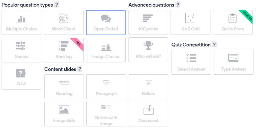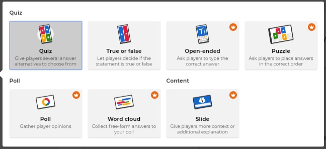 Não são questionários, são jogos, porque possuem uma dinâmica de pontuação, nicknames, tempo de resposta, todos em paralelo, com ranking, onde o professor coordena os tempos para resposta, debate, feedback e evolução. A versão paga gera além de quiz e true/false, oferece: