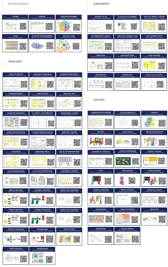 Mais de cem técnicas em categorias como estratégia, modelagem, planejamento. Assim como para os jogos, criei o baralho e o tabuleiro para ampliar e versatilizar seu uso, formato especial, gramatura alta, coloridos, cada um com uma descrição da técnica e o QRCode para um post. Se tiver interesse no baralho e tabuleiro A3 do Desafio Toolbox 360° ou visitar o menu, na página do Toolbox 360°.
