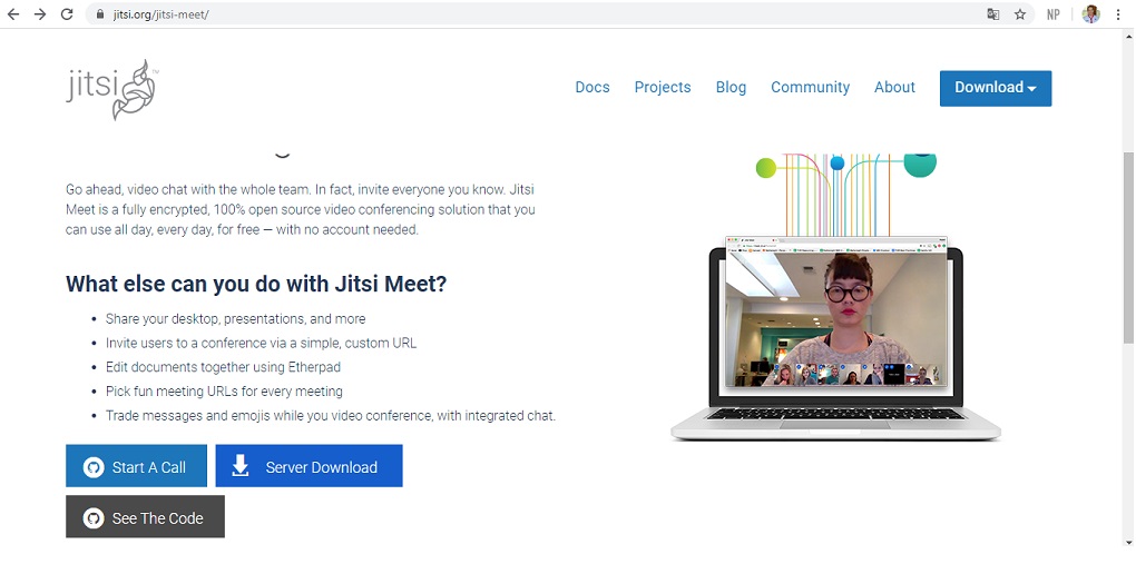 Uma ferramenta 100% free e com muitas facilidades para reuniões, webinars e as famosas lives, posto que pode integrar com um canal de vídeo no youtube. Aparentemente segura (criptografada e com senha) e sem limites, até onde testei e pesquisei. Ela não é um freemium com limites, é uma comunidade de software livre …